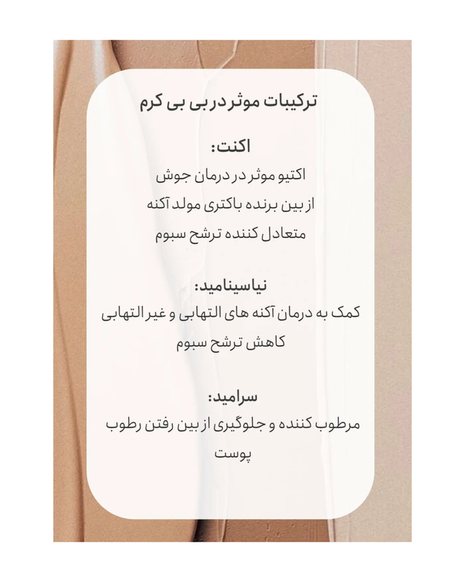 بی بی کرم نوآکنه بسیار سبک با جذب سریع حاوی مواد موثر در جلوگیری و کنترل آکنه، دارای مواد ضد التهاب، رطوبت رسان و آنتی اکسیدان نیز می باشد