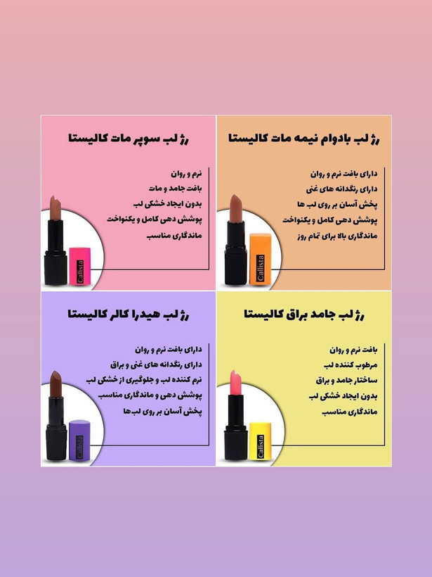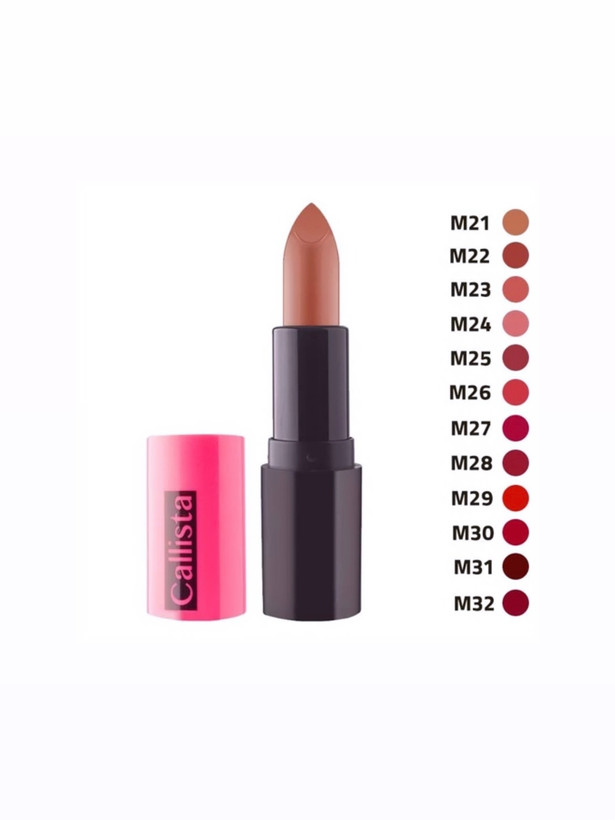 رژلب مات با وجود گوناگونی در دنیای رژ لب ها ، هنوز طرفداران فراوانی داراست و برای آنهایی که میخواهند با بکارگیری از رژ لب ، چهره خودشان را بانشاط نمایش دهند ، گزینش نخست خواهد بود . رژ لبهای مات بهویژه در میان اشخاصی که نمیخواهند روزمره خودآرایی جامع و یا غلیظی داشته باشند و چهره طبیعی و ساده را زیادتر دوست دارند ، استفاده فراوانی خواهد داشت ، ولی نمیتوان گفت که اشخاص دیگر از برتری ها و ظاهر زیبای این کالا صرفنظر میکنند . رژلب جامد مات کالیستا یکی از کالاهای پیرایش لب کالیستا می باشد که با بهره گیری از فرمول ساخت مات به خصوصی که داراست ، بافت و قالب نرم و ماندگاری مناسب را به شما پیشکش می کند . رژ لب جامد مات کالیستا با پوشش یکدست خود بر روی لبها از خشکی پوست آن پیشگیری می نماید .